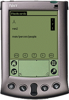 This is a very simple Chinese character flashcard application. It is in its very first incarnation at the moment and so it's very basic - I intend to add many more features when I get the time. The database has 1000 common characters with definitions taken from the CEDICT Chinese-English dictionary project. To run it you need a Chinese OS for the Palm using smplifed characters in the GB2312 encoding. Suitable ones are EVStar, DragonPen and Chinese OS. You need to install both the application and the flashDB database on you Palm. For those of you who want to live dangerously, Flashcards 1.1 has the ability to create your own flashcards. Just invoke the "New Card" menu tiem and type in your card. You don't need to install the card database for this version - it'll create a blank database on startup. For those of you who need a Simplified Chinese-English dictionary on your Palm, I have converted the GB2312 version of CEDICT into KDIC format. Just install KDIC and this database: